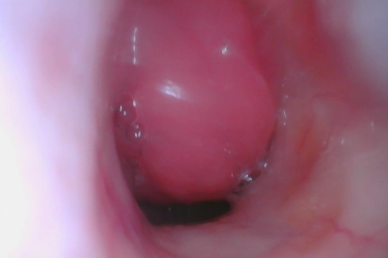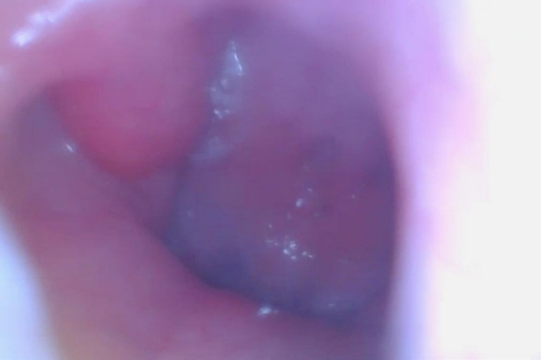 Exame nasofibroscópico mostrando a obstrução da região do cavum e da tuba auditiva, causada pelo aumento do tecido adenoideano. Essa condição pode dificultar a passagem do ar pelo nariz, favorecer infecções de ouvido e prejudicar a qualidade do sono e da audição da criança.